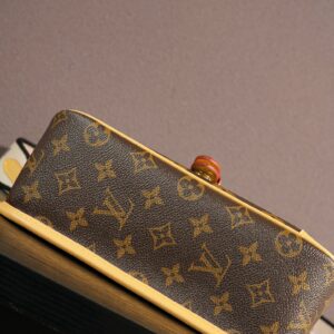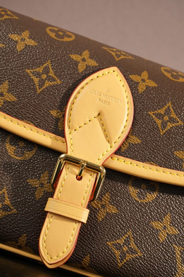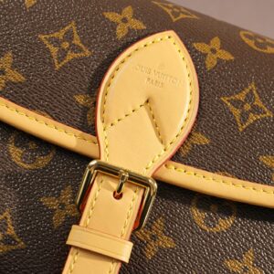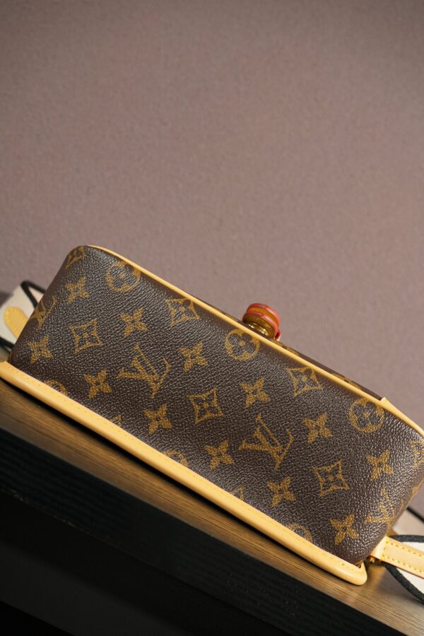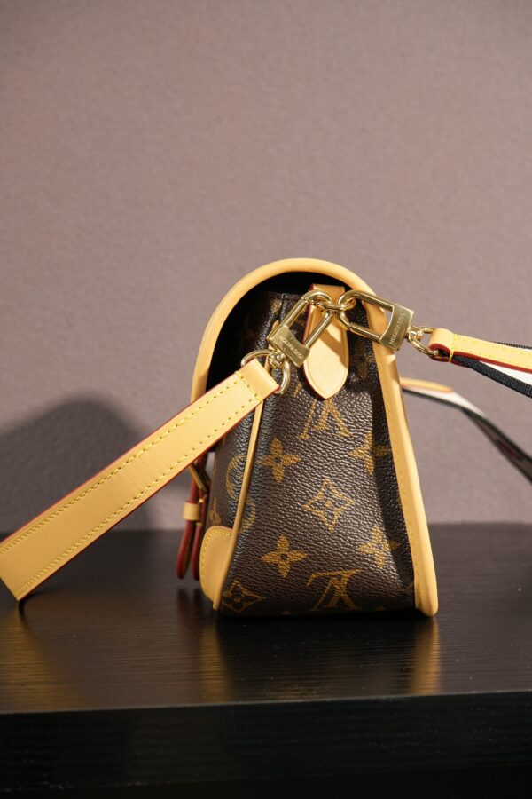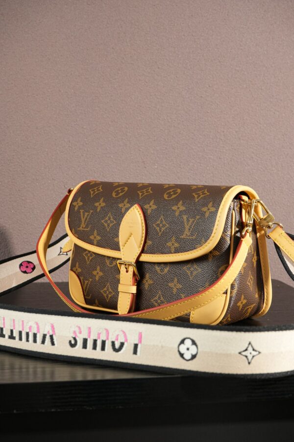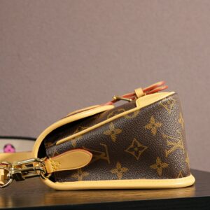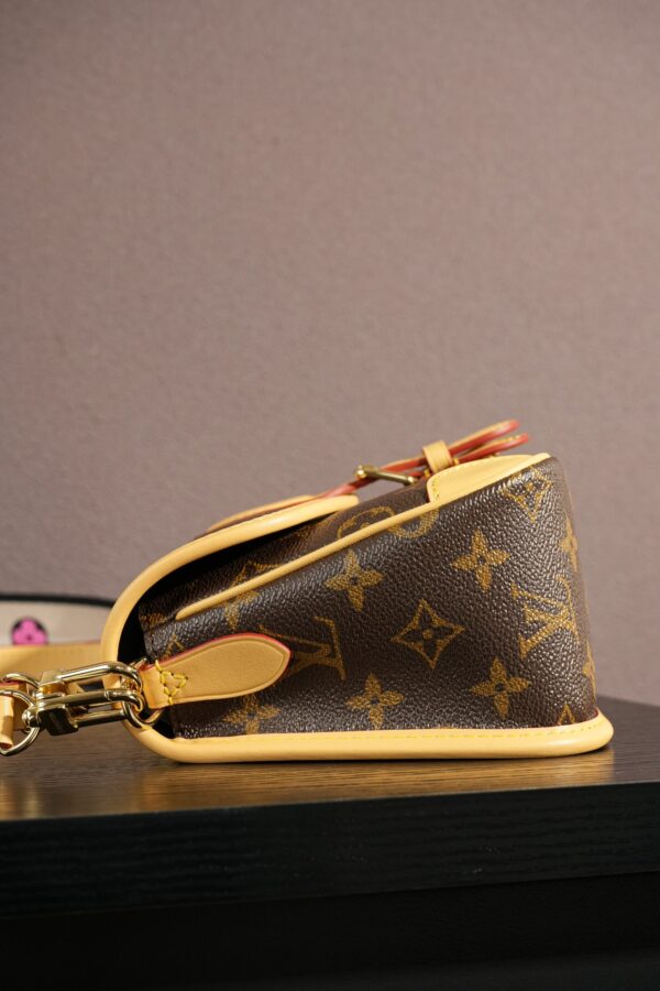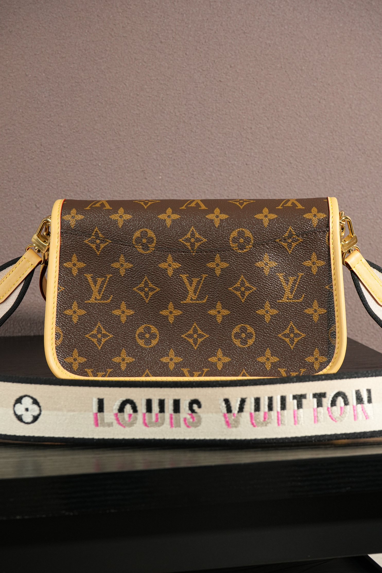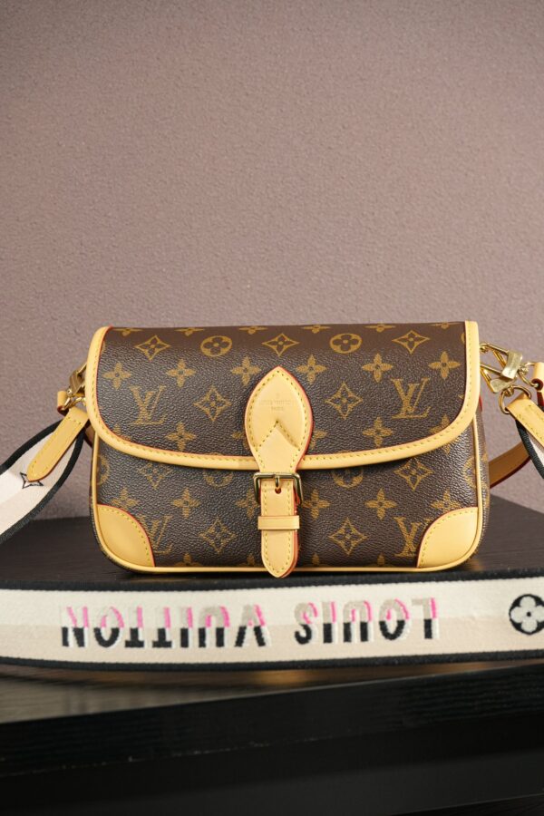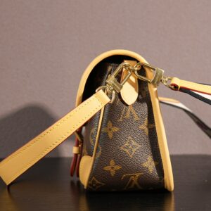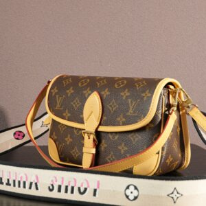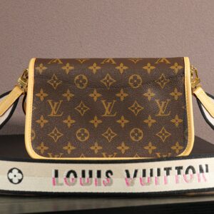 This Diane handbag reinterprets the classic design of the 1990s, integrating retro elements such as leather corners and traditional buckles into the Monogram canvas body, and enhancing modern functionality with neat pockets and a tidy interior. The wide jacquard shoulder strap features the eye-catching Louis Vuitton logo on one side and the Monogram flower pattern on the other.